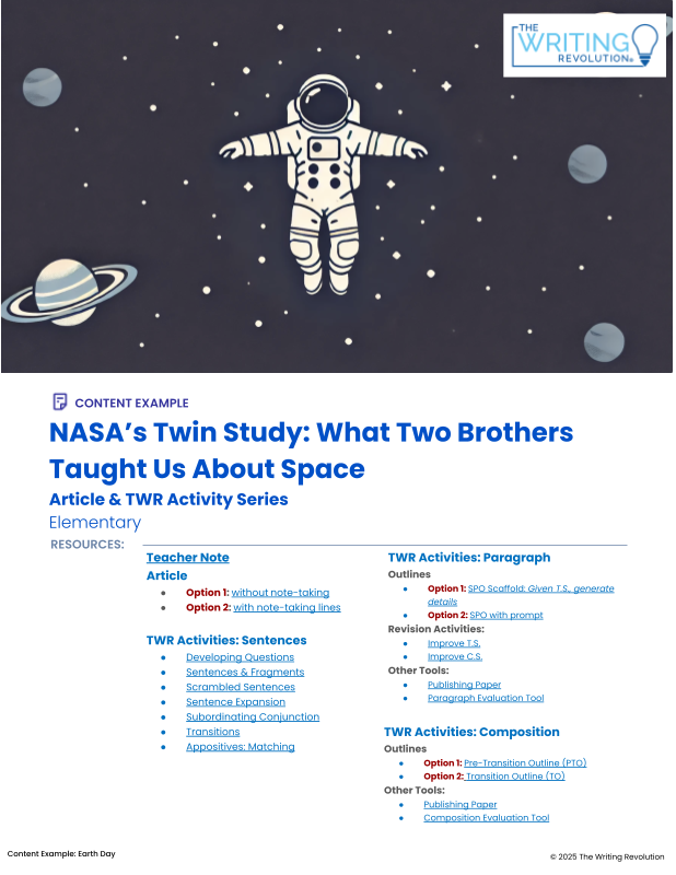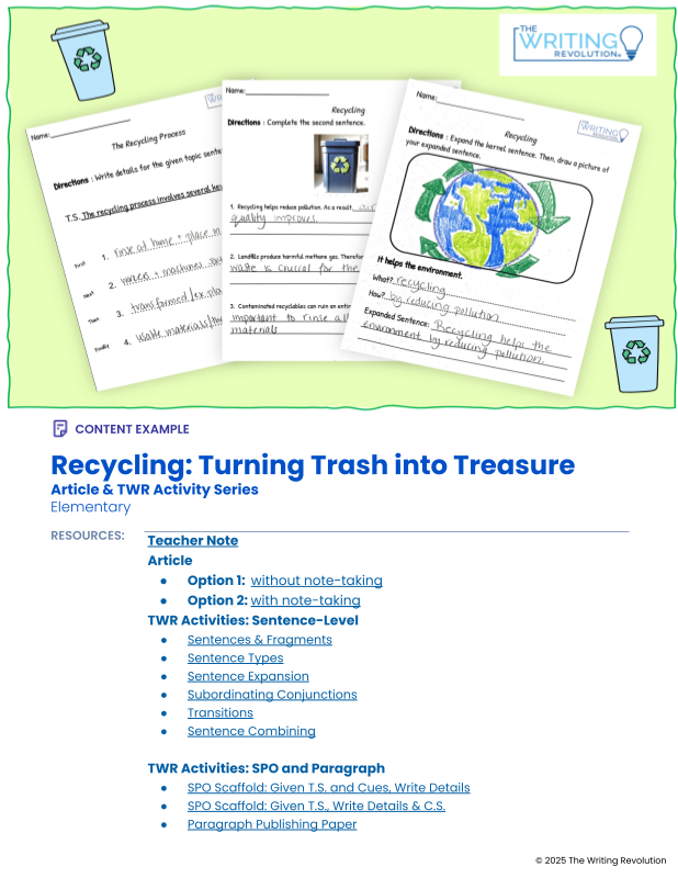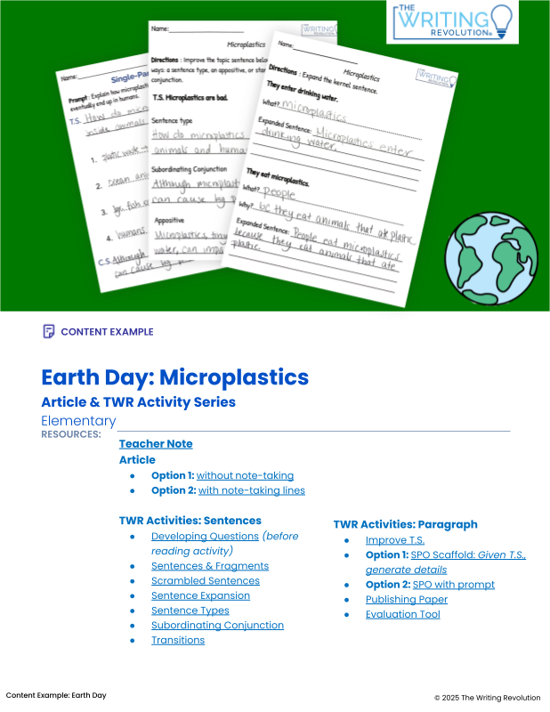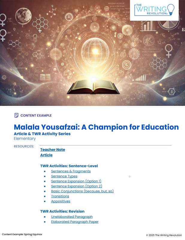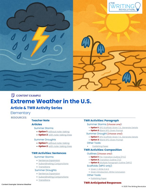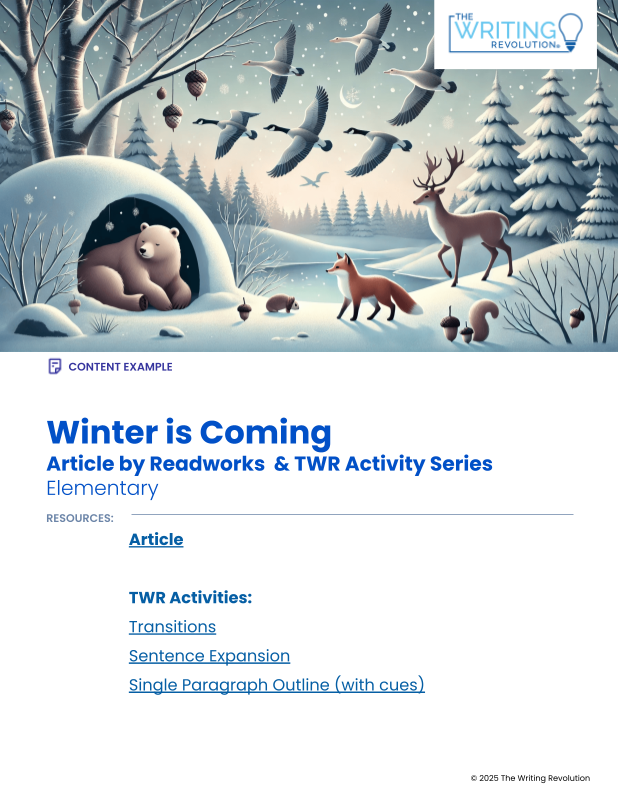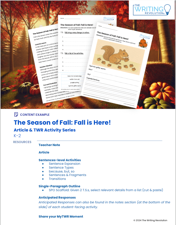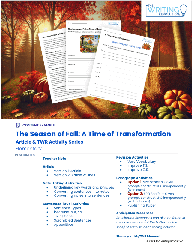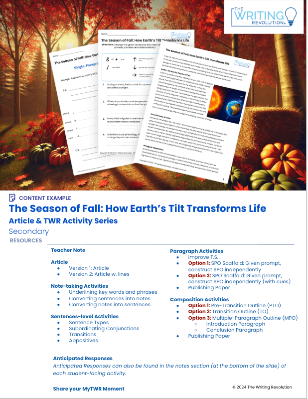 Explore how autumn transforms the natural world with “The Season of Fall: A Time of Transformation” After reading this article, elementary sudents build content knowledge and writing skills through sentence-level practice, note-taking, and paragraph development. Versions of this resource are available for secondary and K–2 learners. For additional autumnal enrichment, explore other seasonal resources under Content Examples in MyTWR Tools.