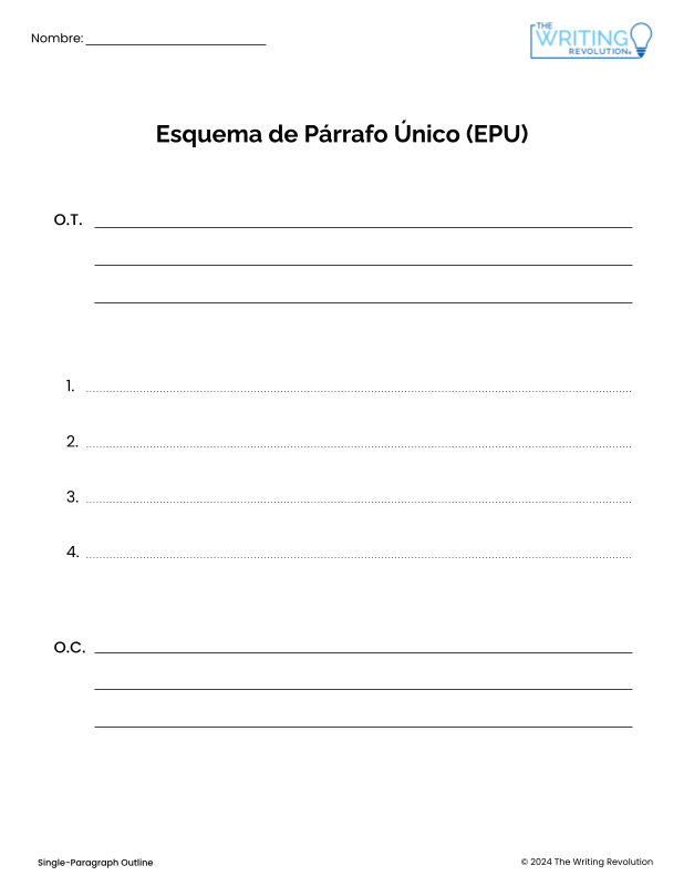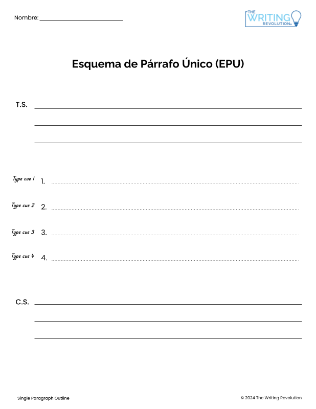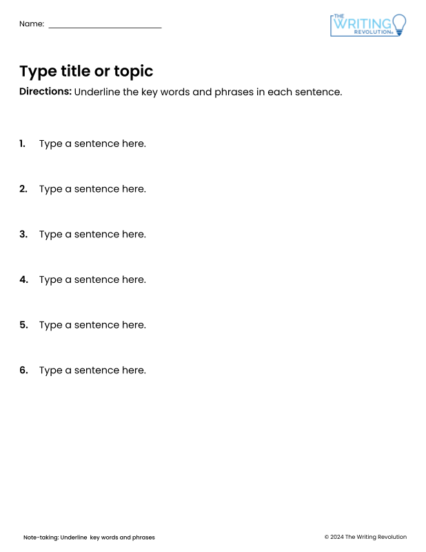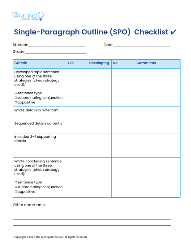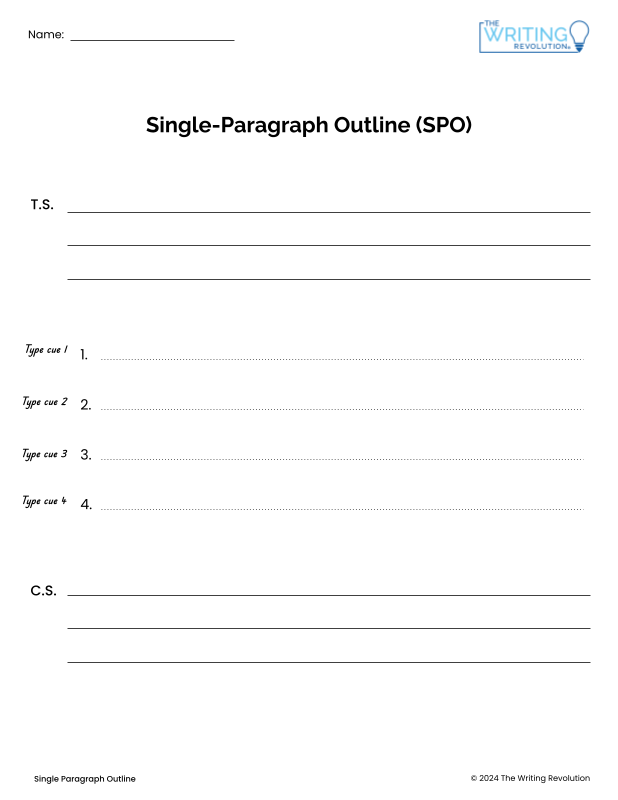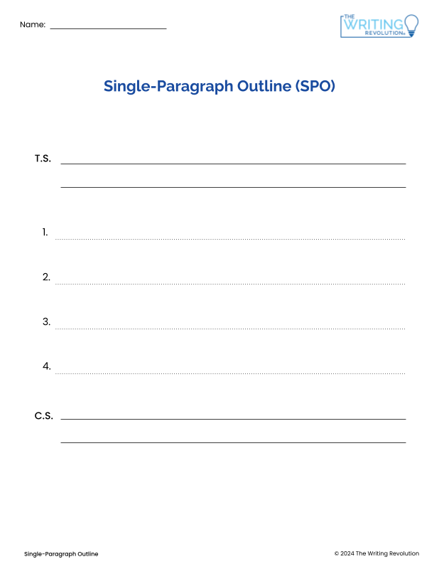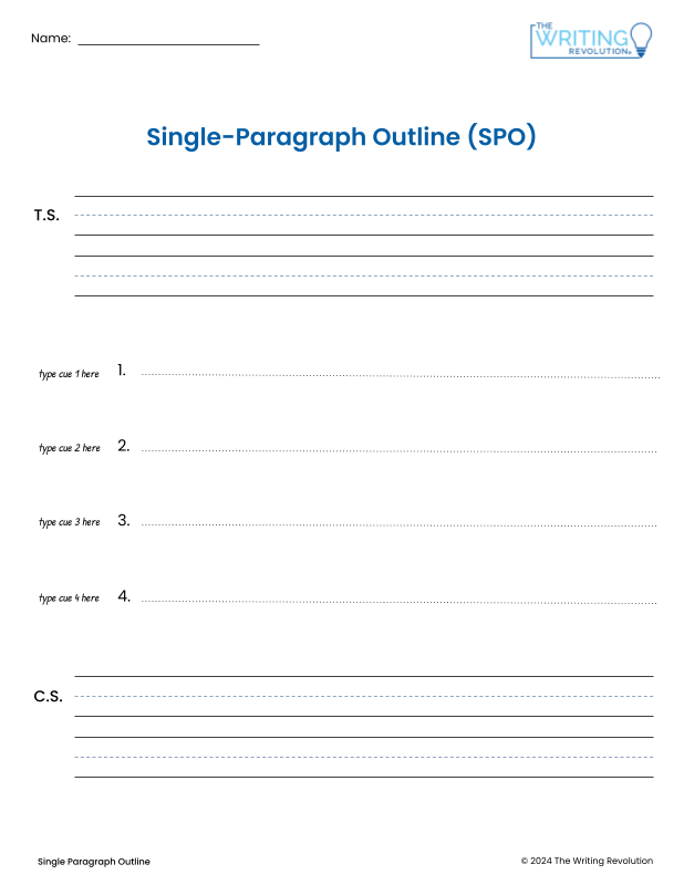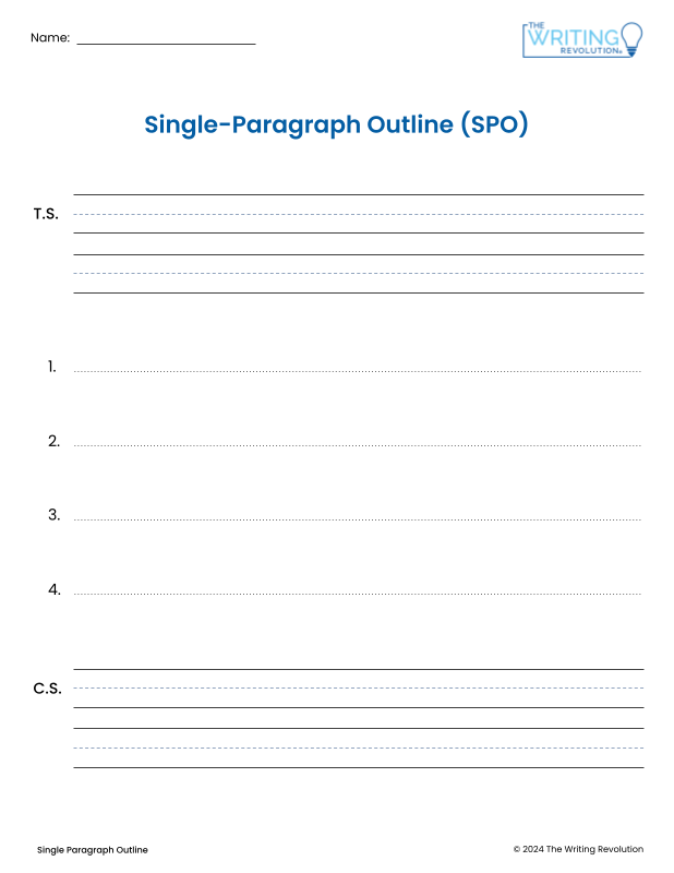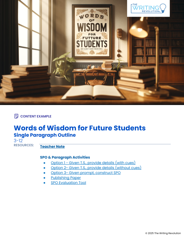 Blank Single-Paragraph Outlines (SPO), Scrambled Sentences, Sentence Types, Basic Conjunctions: because, but, so, Transitions, Appositives, Underlining Key Words & Phrases, Vary Vocabulary, Improve T.S. & C.S., Converting Notes to Sentences, Converting Sentences to Notes, Taking Notes